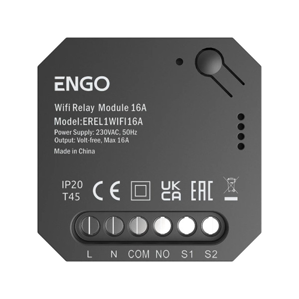 Продукт, розроблений для інтелектуального керування будь-яким пристроєм увімкнення/вимкнення. Вихід без напруги дозволяє керувати пристроями, які потребують схеми закриття або 230В. Ви можете використовувати EREL1WIFI16A для: відкривання/закривання гаражних/в’їзних воріт, управління освітленням, циркуляційним насосом центрального опалення, насосом ГВП, а також джерелом тепла – напр. газовим котлом або тепловим насосом (після конфігурації з іншими компонентами системи). Реле дозволяє встановити розклад роботи в програмі ENGO Smart або правила, у яких ввімкнення/вимкнення залежить від іншого пристрою (наприклад, увімкнення світла, коли датчик відкриття виявляє відкриті двері). Допустиме навантаження на контакти до 16А. Продукт дає можливість підключення датчика температури EFS300 (датчик NTC 10 кОм, продається окремо). Це дозволяє бачити виміряну температуру в додатку та створювати розумні сценарії залежно від цієї температури. Розмір модуля дозволяє розмістити його в монтажній коробці прихованого монтажу.