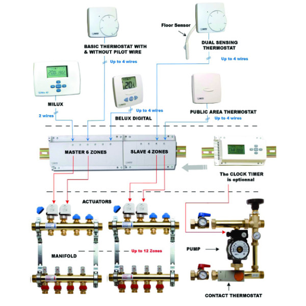 Коммутационный модуль основной (главный, master) на 4 или 6 зон для подключения проводных термостатов cерий BT, Belux, WFHT (включая Milux) к сервоприводам (22CX, 26LC ), реле насоса (8 A), IP 20, модульная конструкция. К каждой зоне можно подключить от 1 до 4 сервоприводов 22С, 26LC . Светодиодная индикация состояния.