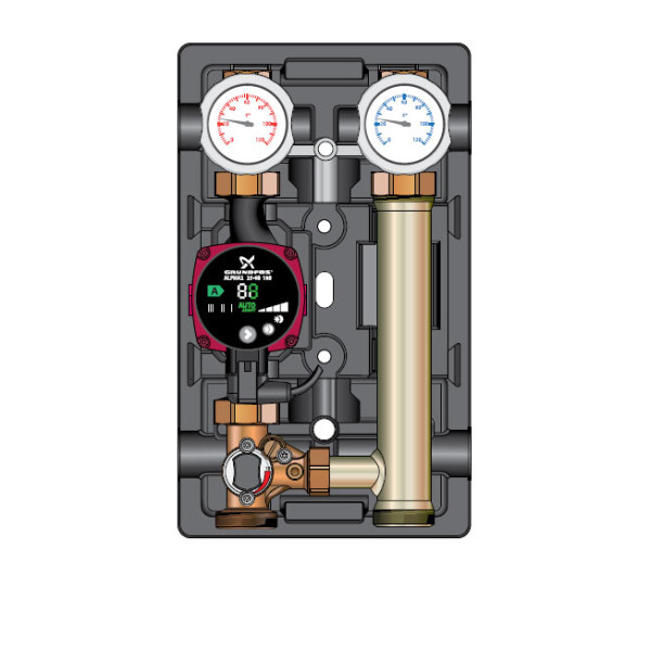 Насосная группа D-MK реализована в виде готового комплекта из арматуры и насоса (опционально), обеспечивающего процесс циркуляции теплоносителя в системе отопления. Группа рассчитана для работы с теплоносителем, роль которого выполняет раствор воды и пропиленгликоля (до 40%). Максимальная температура теплоносителя может составлять 110ºС, а давление – 6 бар.