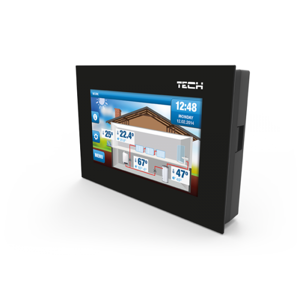 Большой, четкий, цветной, сенсорный дисплей дает возможность комфортно обслуживать регулятор и модулировать его параметры. Легкая установка на стене, эстетический внешний вид, передняя сенсорная панель, а также его невысокая цена - это следующие положительные черты терморегулятора. Простой монтаж в установочной электрической коробке (ø60 мм). Питание 230В 50 Гц.