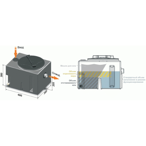 Основные технические характеристики агрегата такие: внешние размеры 380х460 х90, объем отсека для жира – 7 литров, для ила -12 литров, объем мешка – 9,5 литров, скорость очищения воды составляет 0,3 л/с, вес порядка 6 кг.
