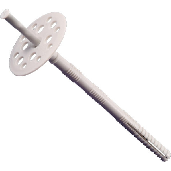 Дюбеля для крепления теплоизоляции с гвоздем из полиамида предназначены для закрепления легких теплоизоляционных материалов в форме плит, в частности пенополистирола (пенопласта) и тяжелых минераловатных и стекловатных теплоизоляционных плит непосредственно к стене перед нанесением армирующего слоя и штукатурки.