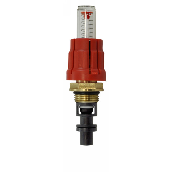 Нужно снять красный фиксирующий обод расходомера и установить необходимое значение потока при помощи вращения. Регулировка потоков коллектора проводится при включенном насосе.