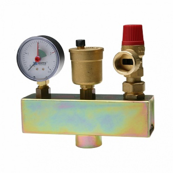 Група безпеки котла для захисту закритих систем опалення до 50 кВт. Включає в себе запобіжний клапан з порогом спрацьовування 3 бари, Автоматичний воздухоотводчик (з запірним клапаном) MKV10R і манометр MHR6 3/43/8", встановлені на сталевій консолі (з гальванічним покриттям). Підключення 1 " Внутрішня різьба.