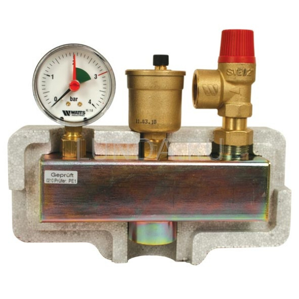 Група безпеки для котла WATTS KSG 30 / 20m-ISO включає три елементи (манометр, воздухоотводчик, запобіжний клапан), закріплених на одній консолі. Манометр MH R6 3/4-3/8" радіальний, підключення⅜", діаметром 63 мм, дозволяє візуально контролювати тиск в системі опалення. Поплавковий воздухоотводчик збирає бульбашки повітря і періодично скидає повітря назовні. Запобіжний клапан при перевищенні встановленого значення 3 Бар відкривається і скидає надлишок теплоносія. Підключення групи безпеки до трубопроводу через внутрішню різьбу 1 " на сталевій консолі з гальванічним покриттям. Теплова ізоляція підвищує ефективність системи, запобігає тепловтрати.