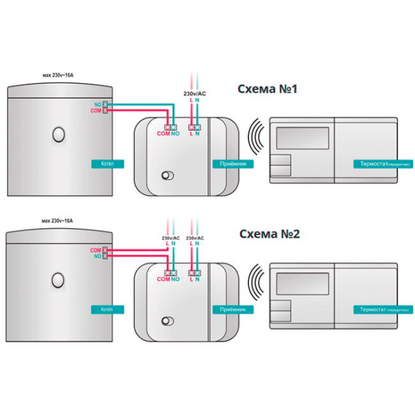 Переносний центр управління з дисплеєм і клавішами для програмування використовується в якості інтерфейсу користувача і для візуального контролю температури. Приймальний пристрій служить для проводового з'єднання з системою включення (виключення) обігріву, зазвичай з опалювальним котлом - газовим або електричним. Важливо, щоб теплогенератор мав клеми для підключення кімнатного термостата.