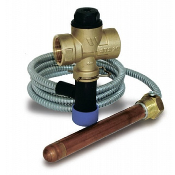 Захисний термоклапан для котлів, що працюють на твердому, не розпиленому паливі. Оснащений подвійним температурним датчиком (підвищення рівня безпеки і надійності) і поворотним (на 360°) з'єднанням капіляра. Занурювана в котел гільза з двома термодатчиками, Довжина 145 мм, Зовнішня різьба 1/2" c різними температурами спрацьовування. Максимальна витрата при відкритому клапані 6500 л / год при тиску 8 бар.