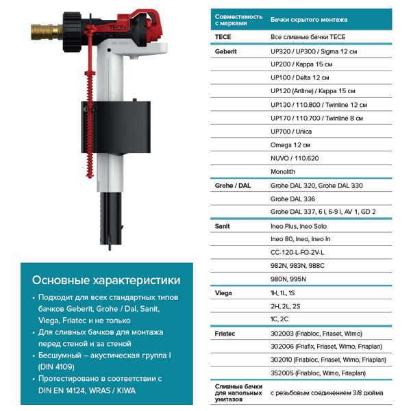Універсальний заливний клапан для установки у всіх зливних бачках TECE, а також в більшості зливних бачків прихованого і відкритого монтажу інших виробників.