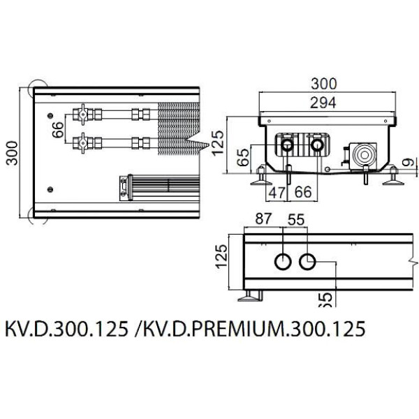 Внутрішньопідлоговий конвектор моделі KV.D.300.125 призначений для опалення та охолодження вологих приміщень. Може використовуватися як автономно в приміщеннях з невисокою потребою в обігріві, так і комбінуватись з іншими опалювальними приладами. Передбачено систему відведення конденсату. Модель характеризується високою теплопродуктивністю завдяки використанню тангенціальних електровентиляторів. Також передбачено роботу конвектора в режимі природної конвекції (без електровентилятора).