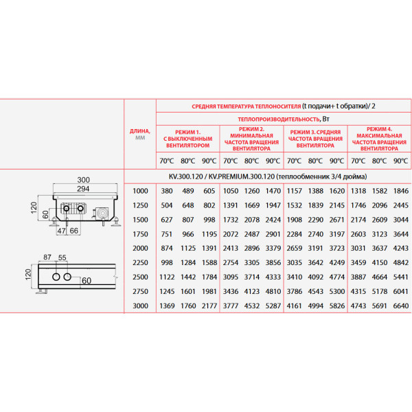 • KV-внутрішньопідлогові конвектори, які комплектуються одним теплообмінником + вентилятор Standart або Premium.