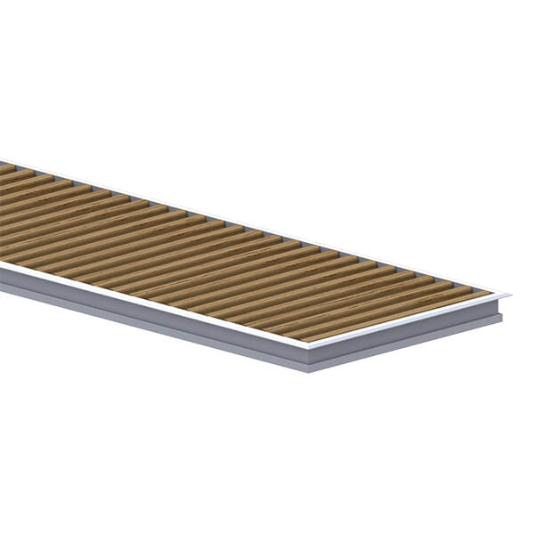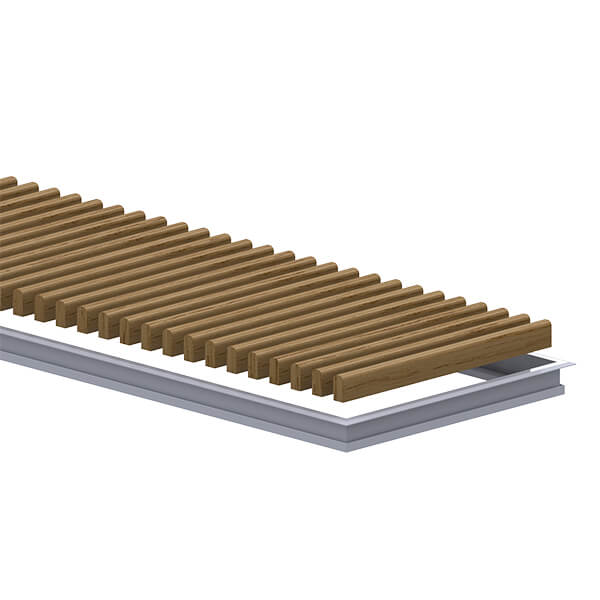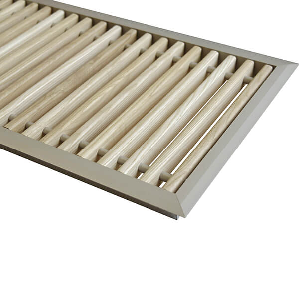 Деревянные решетки изготавливаются из твердых пород древесины (дуб, бук, клен и др.), имеют поперечное расположение ламелей и естественный цвет. При изготовлении деревянных решеток используется профиль толщиной 16 мм, достаточно прочный для того, чтоб выдерживать нагрузки на решетку. Ламели решетки имеют скругленные углы.