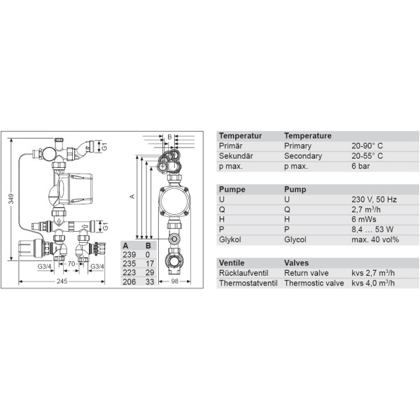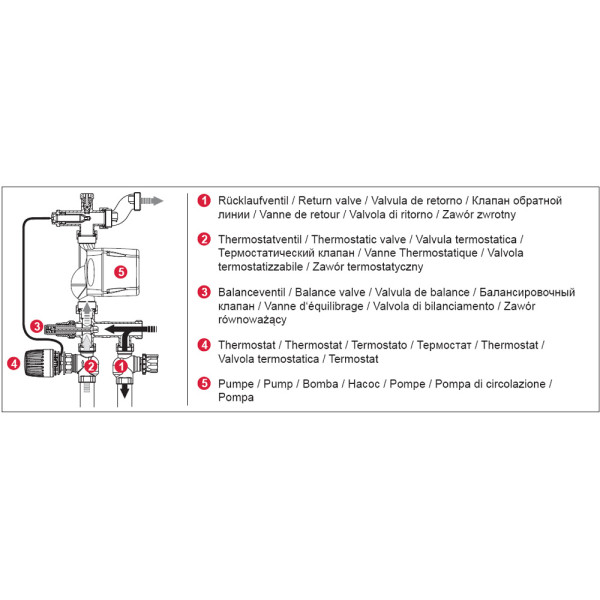Оснащён термостатом (диапазон регулирования 20 - 55 С) с дистанционным датчиком температуры потока, гидравлическим узлом смешивания потоков контуров подачи и возврата для получения необходимой температуры контура и балансировочным вентилем.